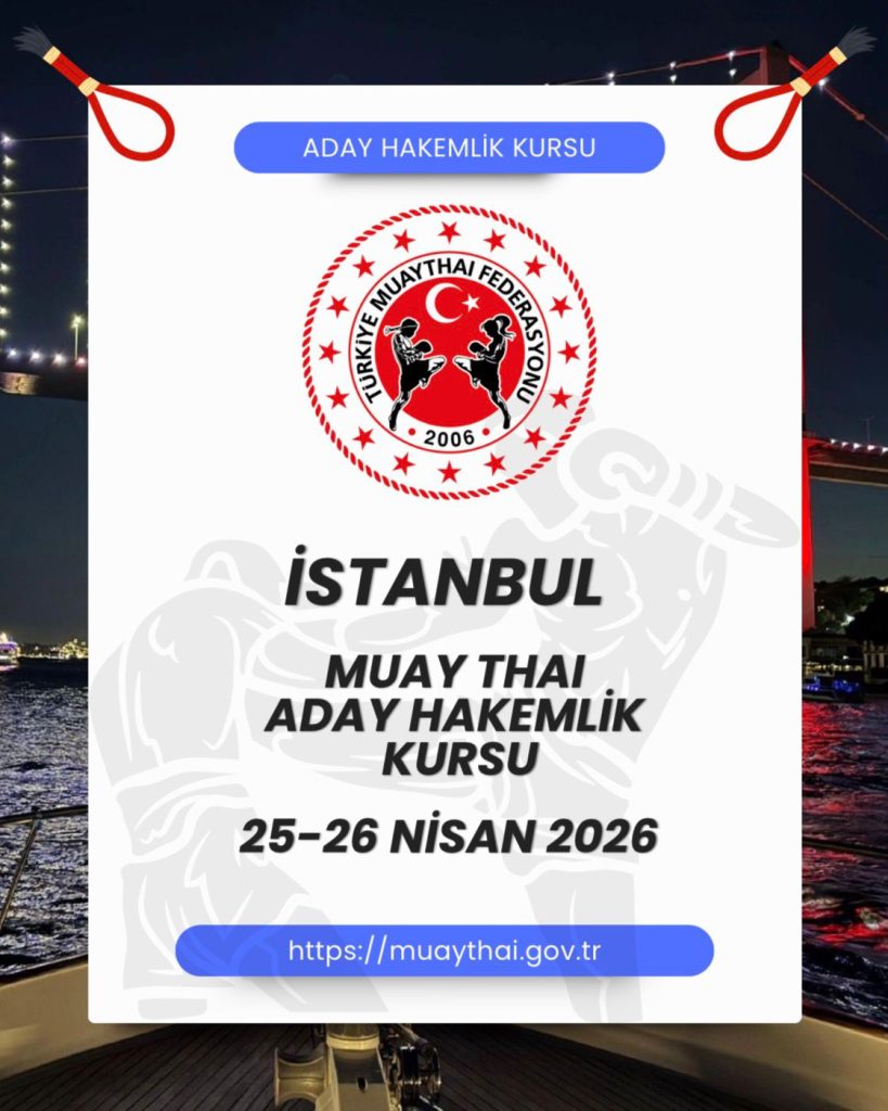 Muaythai Aday Hakem Kursu 25-26 Nisan 2026 tarihlerinde İstanbul’da açılacaktır. İlgili kursa hakem talimatında belirtilen hakem olabilme şartlarını taşıyanlar katılabilecektir.
